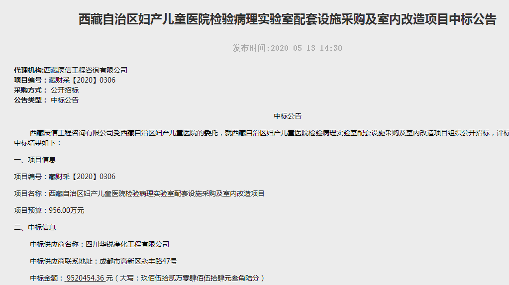西藏辰信工程咨詢有限公司受西藏自治區(qū)婦產(chǎn)兒童醫(yī)院的委托,就西藏自治區(qū)婦產(chǎn)兒童醫(yī)院檢驗病理實驗室配套設(shè)施采購及室內(nèi)改造項目組織公開招標,評標工作已經(jīng)結(jié)束,中標結(jié)果如下: